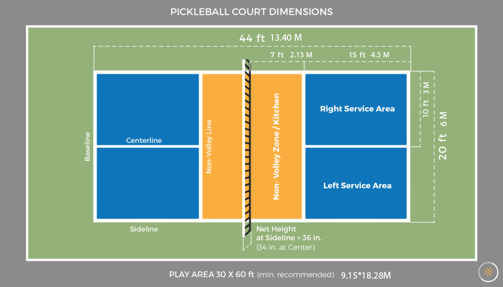 زمين پيكل بال داراي ابعاد زمين بدمينتون است، ولي ارتفاع تور آن مانند ارتفاع تور تنيس است ، راكت آن از چوب و گرافيت درست شد و توپي كه در اين بازي استفاده مي شود به اندازه توپ بيسبال و در رنگ هاي سفيد و زرد است ، هر گيم بازيكن بايد مانند تنيس روي ميز 11 امتياز بگيرد تا برنده گيم شود و در تورنمنت ها برنده بازي 2 گيم از 3 گيم است.ابعاد زمین پیکل بال همانند زمین دبل بدمینون است. طول آن 40/13 متر و عرض آن 10/6 است. فاصله خط سرویس از لب تور 13/2 متر است. قسمت جلوی خط سرویس تا تور  (شامل خط های دور زمین  و خط منطقه سرویس) را منطقه “عدم ضربه والی” یا منطقه “کیچن ” می نامند. از پشت قسمت کیچن تا بیس لاین دو منطقه سرویس چپ و راست است که شامل خط های دور زمین نیز می شود.